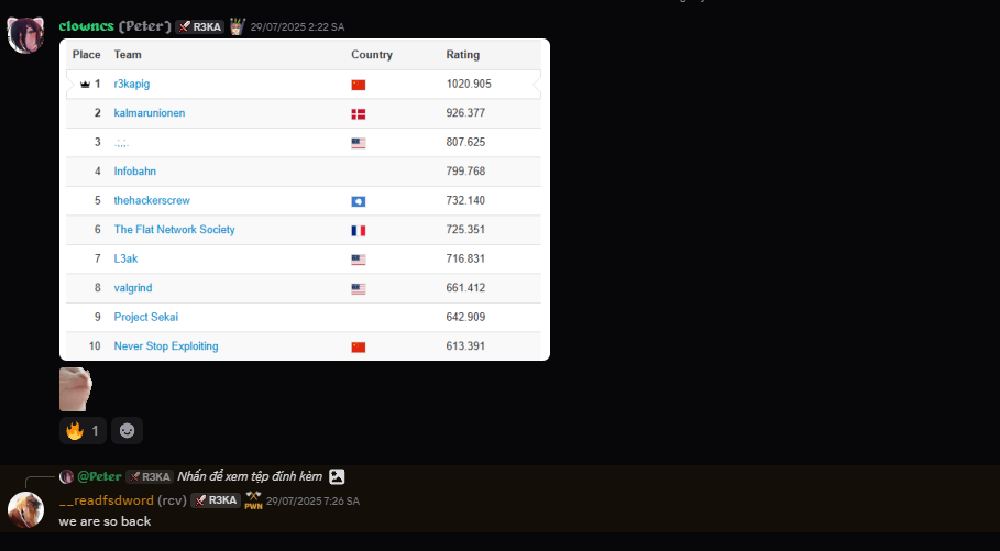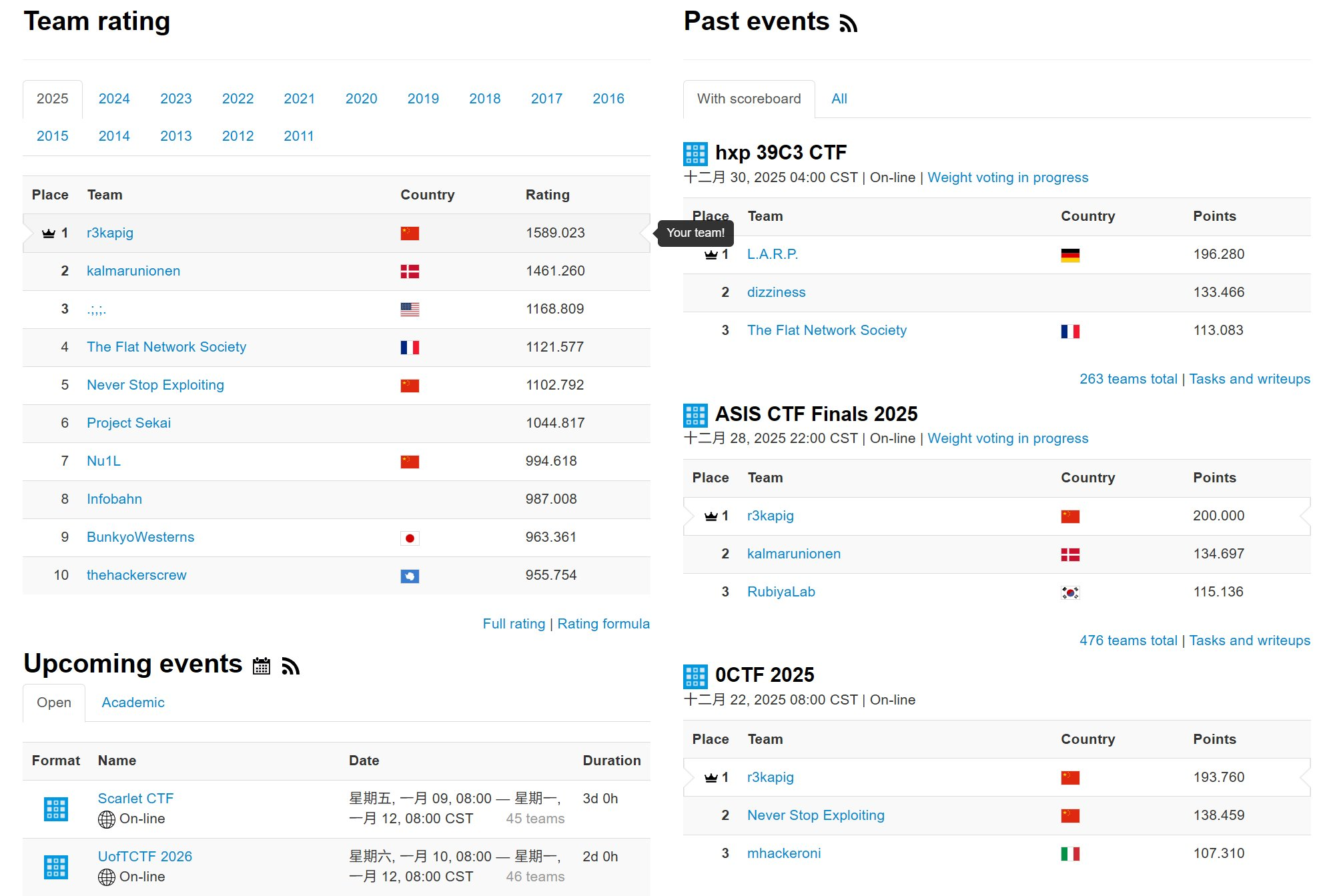 So, was this the final trip of 2025? Does the blog end here? Not quite—we still have plenty of December left! But there is one last thing I want to share: my team, r3kapig, finally reached the #1 rank on CTFtime for 2025!