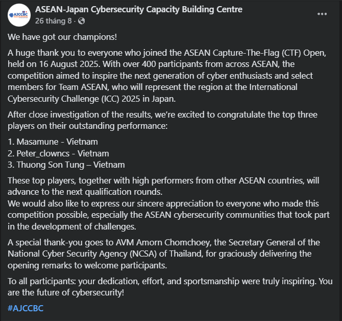I believe this was the best CTF hosted in the ASEAN region in recent years. Kaspersky and Drovosec did a fantastic job organizing such an incredible CTF and conference; I truly enjoyed every moment of the three days I spent in Thailand for this event.