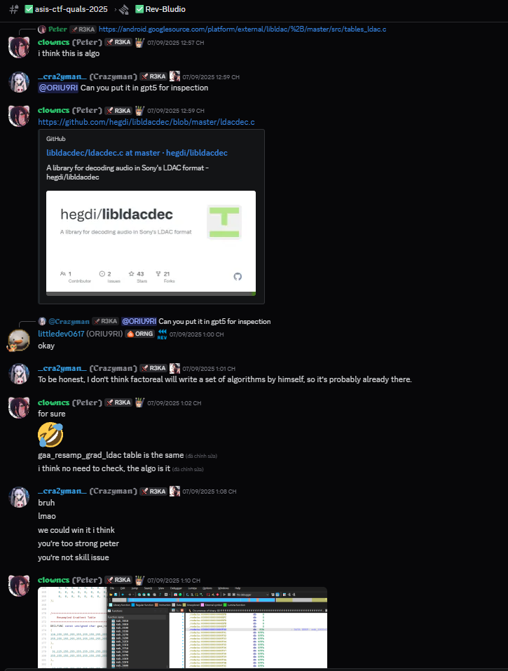 That challenge ended up with only 3 solves in total, including ours. The main struggle was figuring out the sound encoding algorithm, especially since the decompiled code was pretty much a mess. At first, I was completely stuck on how to approach it.