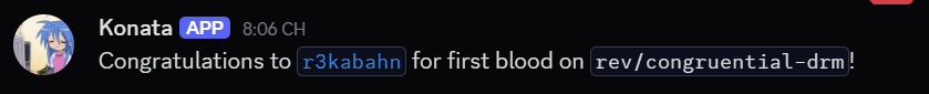 Speaking of Reverse, I got pretty lucky and scored First Blood on the hardest RE challenge (which only 3 teams solved by the end) and managed to clear the whole category. It was an awesome feeling, and I felt a bit proud of myself for pulling that off.