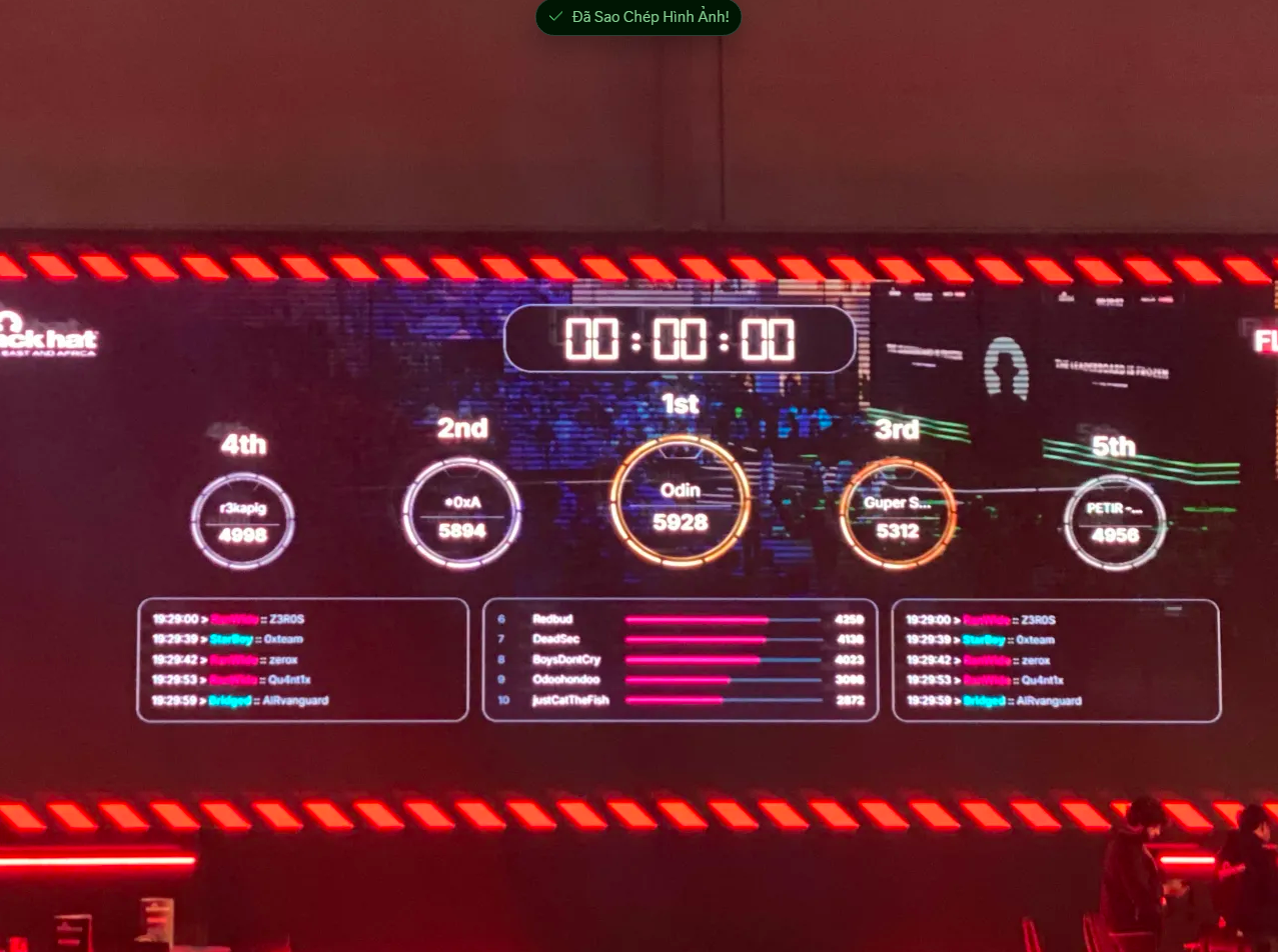 After I left the CTF zone 30 minutes, the scoreboard was frozen. At that moment, we were sitting in 2nd place. I took that time to walk around and see the rest of the venue, but by the time I returned for the finish, our team hadn’t managed to solve any more challenges. We were incredibly nervous, wondering if our rank would hold or if we would slip down the standings in the final minutes.
