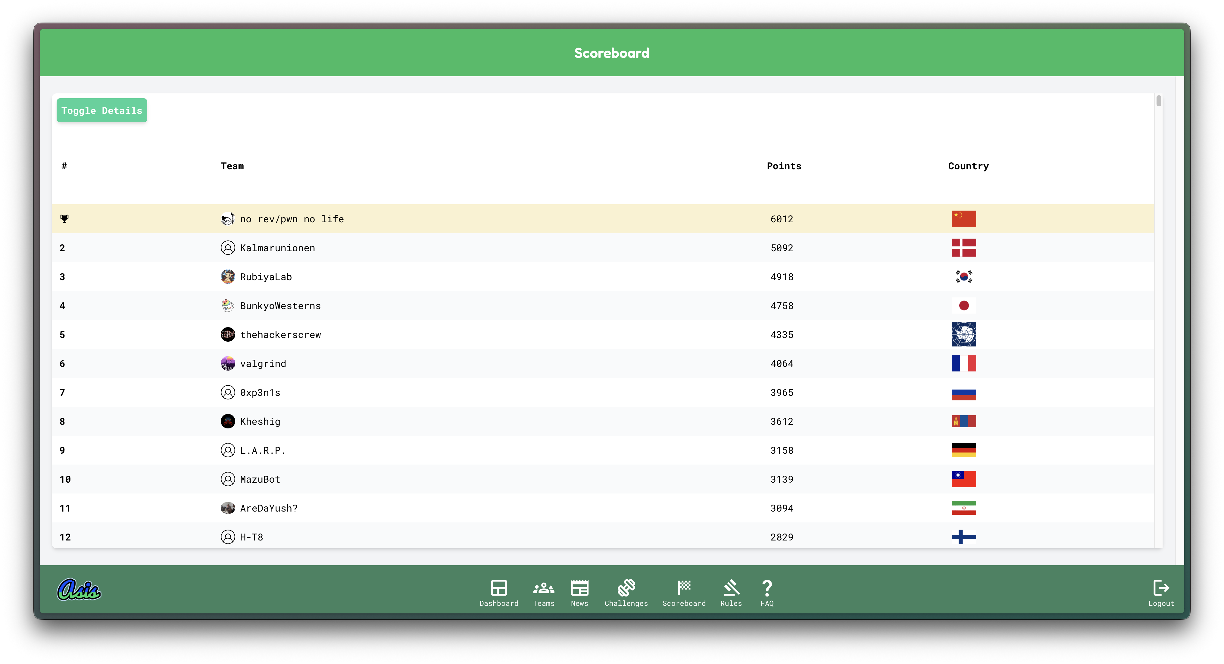 In the end, we narrowly lost to Kalmarunionen because we missed a few pwn/crypto solves, finishing in 2nd place. But my teammates really gave it their all, so I’m totally happy with the result.
